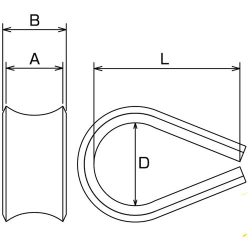 Catalog number: B-2534 Features: ● Rope course exclusively for fiber ropes. Applications: ● Prevents rope wear when the end of a fiber rope is eye-processed and used. Specifications: ● A (mm): 22 ● B (mm): 25 ● D (mm): 33 ● L (mm): 59 ● Rope diameter (mm): 19 Material/Finish: ● Stainless steel (SUS304)