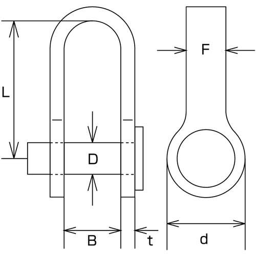 Catalog number: B-1222 Features: ● The pin will not come off if you hit it with a hammer. ● Colorful. Applications: ● For connecting chains, wires, ropes, etc., and for joining metal fittings at terminals. ● Particularly in places where there is a possibility of the pin coming loose with a normal shackle due to a lot of vibration. Specifications: ● Working load (kN): 0.29 ● B (mm): 7 ● D (mm): 4 ● F (mm): 4 ● L (mm): 19 ● d (mm): 9 ● t (mm): 1.5 ● Color: Red Material/Finish: ● Stainless steel (SUS304)