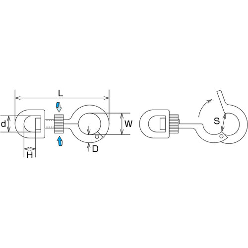 Catalog number: B-2101 Features: ●The eye part rotates, so it will not get tangled when connected. ●The eye can be opened and closed by loosening the nut. ●The eye opens wide. Applications: ●As a connecting fitting for chains, wires, ropes, etc., and as a joint for terminal fittings. Specifications: ●Working load (kN): 0.07 ●Thread diameter: M-6 ●D (mm): 5 ●L (mm): 56 ●S (mm): 11 ●W (mm): 13 ●H (mm): 8 ●d (mm): 10 Material/Finish: ●Stainless steel (SUS304) ●Finish: Barrel polishing finish