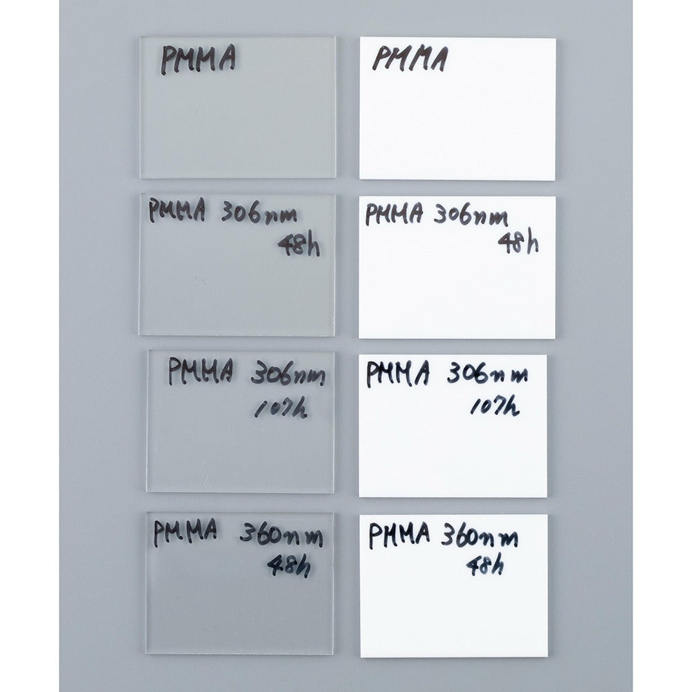 This testing machine is equipped with four fluorescent lamps and irradiates UV-A ultraviolet rays. Weather resistance can be easily evaluated using ultraviolet rays. It is equipped with a power-on time integrator, so you can see the total irradiation time at a glance. It has a door switch, so the fluorescent light will turn off when the door is opened. Size (mm): 500 x 400 x 518 Weight (kg): Approx. 17 Internal dimensions: 460 x 336 x 282 mm UV lamp: 15W x 4 Maximum illumination: Approx. 370Lx Equipped with a power-on time accumulator and a thermometer for checking the inside of the cabinet Safety devices: overcurrent fuse, door switch Light source life expectancy: Approximately 4000 hours Peak wavelength: Around 360 nm (ultraviolet rays in the wavelength range of 315 to 400 nm) Power supply: AC100V 50/60Hz 2P plug Cord length: 1.8m