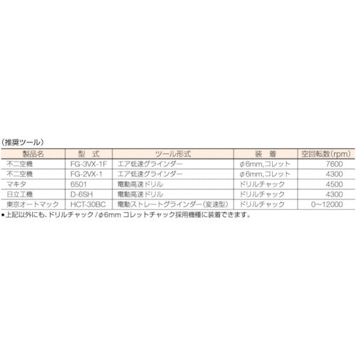 Catalogue number: BR MGRT 220 50 Features: ● Flexible special resin is processed into a fine brush shape, so it fits well even on objects with complex shapes. ● The bristles reach recesses well, so it can be used comfortably in places where abrasive nylon brushes could not reach. ● It has a higher polishing power than wire brushes and abrasive nylon brushes, so it can significantly reduce the time required for conventional deburring work. ● It only removes small burrs, dirt, and coatings, and does not over-cut the object to be polished. ● There is no effect of heat generation or clogging, and new abrasive grains are always exposed, so the polishing power is constant from the start to the end of the work. Applications: ● For removing burrs and burrs after cutting. ● For removing burrs after end mill processing. ● Removing protruding burrs from rubber linings. ● Removing scratches and oxide coatings from die-cast parts. ● Polishing the inside of pipes. Specifications: ●Outer diameter (mm): 50.8 ●Shaft diameter (mm): 6 ●Maximum operating speed (rpm): 12000 ●Grain size (#): 220 ●Abrasive: Aluminum oxide ●Color: Reddish brown ●Equivalent finish number (#): 220 ●Sold in units of 5 Materials/Finish: ●Abrasive: Ceramic abrasive, Aluminum oxide (80, 120) Aluminum oxide (220, 400, 6M, 1M) PUM ●Shaft: Steel Note: ●This product is not intended for general consumers, so there are no labels or instructions included for general consumers. ●Please use at speeds of less than 12000 rpm. ●PUM is a fine abrasive that does not leave streaks on the workpiece.