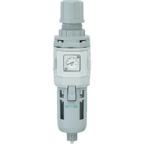 Catalog number: W8000-25-WF Features: * Air filter and regulator integrated into a compact unit. * Removes drainage and dust from the air and adjusts pressure. * The element used has a unique chemical fiber structure with a rough surface and finer grains toward the inside. This greatly reduces clogging and extends the life of the element. Applications: * Removes drainage and dust from the air and adjusts pressure. Specifications: Filtration accuracy (μm): 5 Operating pressure (MPa): 1 Air flow rate (m3/min): 10 Set pressure (MPa): 0.05-0.85 Connection size: Rc1 Overall length (mm): 409.0 Overall width (mm): 100 Fluid used: Air Fluid used: Air Fluid temperature (℃): 5-60℃ Drain discharge method: Auto drain With pressure gauge Note: For the W3000-8000-WF series, the minimum operating pressure of the auto drain is 0.1MPa. Air is purged along with the initial drain until it rises by 0.1MPa.