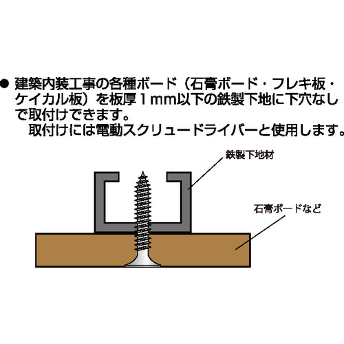 Catalog number: 00041590 Features: ● Can be attached to gypsum board, flexible board, calcium silicate board, etc. on steel substrates (plate thickness 1mm or less) without pilot holes. Uses: ● For fastening walls and ceiling materials to steel substrates. Specifications: ● Dimensions (mm) d: 3.5 ● Total length (mm): 22 ● Head diameter (mm): 8 ● Compatible screwdriver: Phillips No. 2 ● Dimensions (mm) d x total length: 3.5 x 22 ● Type: Trumpet head ● Trumpet head Material/Finish: ● Stainless steel (SUS410) ● Surface treatment: Passivated