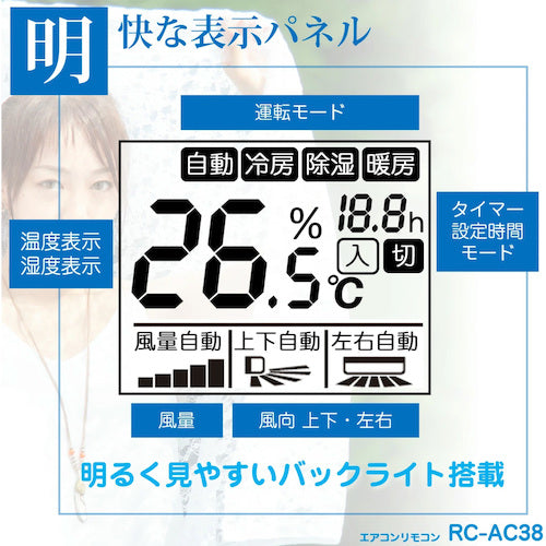 Catalog number: RC-AC38 Features: ● Compatible manufacturers: Iris Ohyama 2017 and up, Corona 1991 and up, Sanyo 1991 and up, Sharp 1990 and up, Daikin 1990 and up, Hisense 2019 and up, Panasonic 1983 and up, Fifty 2014 and up, Funai 1995 and up, Mitsubishi Heavy Industries 1991 and up, Mitsubishi Electric 1988 and up, Chofu 1992 and up, Toshiba 1993 and up, Hitachi 1989 and up, Fujitsu General 1989 and up, LG 1996 and up. ● Main operations of air conditioners are possible. ● Auto search is included to automatically search for manufacturer codes. ● Compatible with 16 major manufacturers. ● Temperature can be adjusted in 0.5°C increments (compatible devices only). ● LCD screen with backlight function for convenient nighttime operation. ●Timer setting function that can turn on/off after a set time. ●No need to reset when changing batteries, equipped with a backup function. Uses: ●When the remote control breaks down. Specifications: ●Operating distance (m): 7 ●Height (mm): 160 ●Width (mm): 56 ●Thickness (mm): 22.5 ●Color: White ●Power supply: 2 AAA batteries (sold separately) ●Power supply (V): 2 AAA batteries (sold separately) ●Power supply: 2 AAA batteries (sold separately) ●Battery life: Approximately 12 months Note: ●Some devices may not be compatible with the applicable manufacturer and year of manufacture. Please be aware of this in advance.