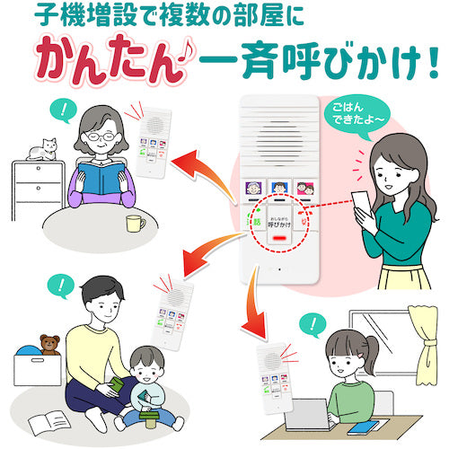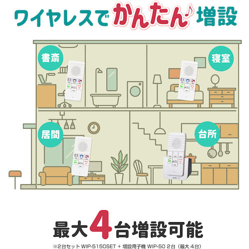 Catalog number: WIP-5150SET Features: ●No wiring required, rechargeable, so you can carry it around and use it. Applications: ●For indoor communication Specifications: ●Width (mm): 85 ●Depth (mm): 57 ●Height (mm): 70 ●Power supply: Charging base main unit DC5V / Charging base DC5V / Child unit Nickel-hydrogen rechargeable battery DC2.4V/750mAh ●Power consumption (W): Charging base main unit (standby) approx. 1.0W (when charging) approx. 2.0W / Charging base (standby) approx. 0.1W (when charging) approx. 1.1W ●Width x depth x height (mm): 85 x 57 x 70 (charging base main unit), 85 x 57 x 70 (charging base), 57 x 22 x 137 (137 child unit) ●Power supply: (child unit) Nickel-hydrogen rechargeable battery DC2.4V/750mAh (charging base) DC5V AC adapter included. Continuous use time: (when talking) about 3 hours (when on standby) about 100 hours. Charging time: about 15 hours. Dimensions: (charging base) 85 x 57 x 70 mm (handset) 57 x 22 x 137 mm. Wireless communication method: 1.9 GHz DECT compliant method. Communication distance: about 100 m in line of sight. Chime sound: 3 types. Set contents/accessories: 2 rechargeable batteries, 2 AC adapters (cord length: about 1.8 m), 1 sticker for handset number, 4 mounting screws (Φ4 mm x 25 mm), 4 sleeves (Φ6 mm x 30 mm).