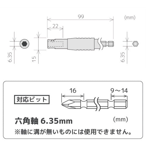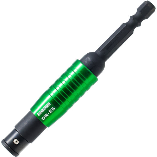 Catalog number: DR-25 Features: ● Extension with joint that can remove screws close to the wall. ● Can be tilted 15 degrees with a folding mechanism. ● Can also be used as a 100mm extension bit. ● Compatible with impact (for a short time). Applications: ● For removing screws in corners and close to walls. Specifications: ● Total length (mm): 100 ● Outer diameter (mm): 15 ● Opposite side (mm): 6.35 ● Hexagonal shaft (mm): 6.35 Material/Finish: ● Body: High carbon steel ● Sleeve: Aluminum Caution: ● If used continuously for several tens of seconds, the joints will become hot, so cool them with lubricant while working. ● When using in the swivel position, be careful of the tip shaking. ● Cannot hold bits without grooves.