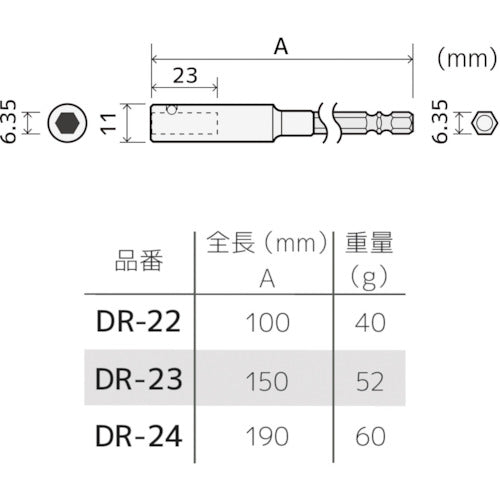 Catalog number: DR-24 Features: ●This is a tough extension bar that can be attached to a through-hole driver and used for hitting. ●Compatible with 18V electric impact. ●The slim head is convenient for use in narrow spaces. Uses: ●For extending 6.35mm hexagonal shaft bits and drills. ●For extending through-hole drivers and electric impact drivers. ●For working in narrow, deep spaces. Specifications: ●Total length (mm): 190 ●Outer diameter (mm): 11 ●Face (mm): 6.35 ●Hexagonal shaft (mm): 6.35 Material/Finish: ●High carbon steel Caution: ●Do not hit the main body directly. ●Do not hit with a double-ended bit attached. ●The bit may be damaged. ●When attaching the bit, check that there is no risk of it falling off.