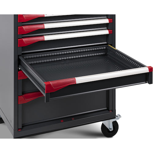 Catalog number: SM32R085S0130139 Features: ●A sturdy and beautifully made Italian tool trolley for professional users. ●The ball bearing guide rails allow the drawers to be opened and closed smoothly. ●The drawers can be pulled out 100%, making it easy to take things in and out. ●The drawers can be unlocked by pushing the cylinder lock. ●The drawers will not pop out during transportation. Uses: ●For storing tools. Specifications: ●Maximum load capacity (kg/unit): 180 ●Uniform load capacity (kg/tier): 92% pulled out: 100, 96%: 75, 100%: 50 ●Color: Dark gray ●Width (mm): 788 ●Depth (mm): 599 ●Height (mm): 1068 ●Drawers (tiers): 7 ●Drawers: 50mm x 1 tier, 75mm x 2 tiers, 100mm x 2 tiers, 150mm x 1 tier, 200mm x 1 tier ● Caster diameter (mm): 125 ● Drawer inner dimensions (mm) Frontage x Depth x Depth: 602 x 449 x 34 (1 tier), 602 x 449 x 59 (2 tiers), 602 x 449 x 84 (2 tiers), 602 x 449 x 134 (1 tier), 602 x 449 x 184 (1 tier) ● Casters: Fixed 125 mm (2 pcs), Swivel with stopper 125 mm (2 pcs) ● Ball bearing guide rail ● Lock: Cylinder lock type Material/Finish: ● Steel