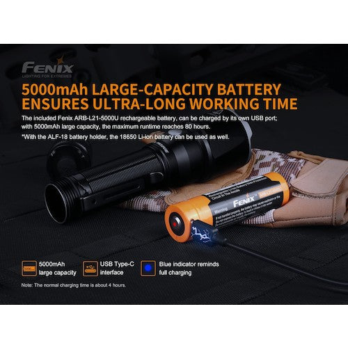 Catalog number: TK22UE Features: ●The tail switch structure enables instant power operation. Specifications: Brightness (lm): 1600 Color: Black Outer diameter (mm): 40 Total length (mm): 150 Power supply (V): (21700 rechargeable battery) x 1 / (18650 rechargeable battery) x 1 Maximum lighting time (h): 80 Protection rating: IP68 Illumination distance (m): 405 Drop resistance (m): 1 Power supply: (21700 rechargeable battery) x 1 / (18650 rechargeable battery) x 1 Total luminous flux (lm): 1600 Width (mm): 40 Power supply: 1 dedicated rechargeable battery (included) Maximum lighting time: Approximately 60 hours (at 30lm) Protection rating: IP68 Maximum lighting distance: 405m (at 1600lm) Set contents / accessories: 1 dedicated rechargeable battery ARB-L21-5000 Type C charging cable Holder for 18650 type battery Strap O-ring