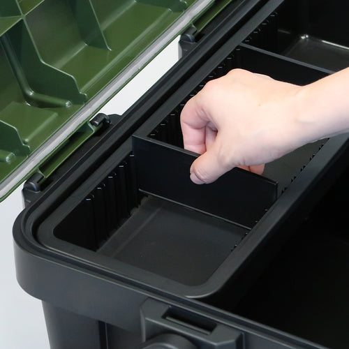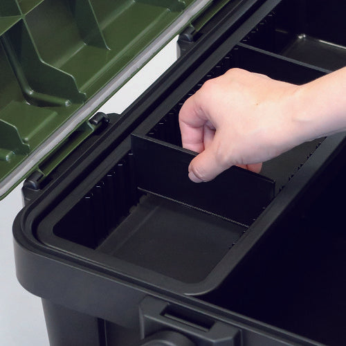 Catalog number: SBS500X Features: ●The frame on the back of the lid has a gasket to prevent water and dust from getting in. ●It has outstanding strength with a load capacity of 500 kgf (lid) and can be used as a step stool or chair. ●The convenient half-type tray has two dividers. ●It can be stacked up to three layers. Uses: ●Convenient for storing tools, outdoor equipment, etc. Specifications: ●Color: Black Green ●External dimensions (mm) Width: 518 ●External dimensions (mm) Depth: 360 ●External dimensions (mm) Height: 345 ●Effective internal dimensions (mm) Width: 370 ●Effective internal dimensions (mm) Depth: 250 ●Effective internal dimensions (mm) Height: 265 ●Padlock (sold separately): Can be installed ●Load capacity (kg): 500 ●Maximum load weight (kg): 500 ●Maximum storage weight (kg): 20 ●Depth (mm): 345 ●Width (mm): 360 Material/Finish: ●Body: Polypropylene (PP) ●Packing: Expanded polyethylene Set contents/Accessories: ●Half tray (tray has 2 dividers)