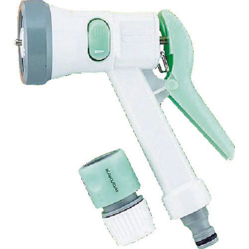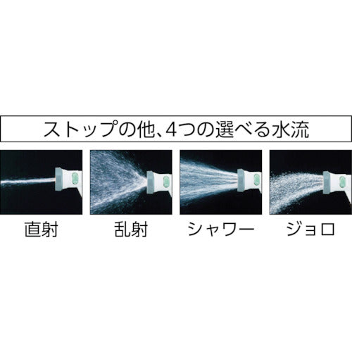 Catalog number: 525-505 Features: ●By gripping the lever and switching the button, it can be changed to direct spray, random spray, shower, watering can, or stop water. Specifications: ●Height (mm): 144.5 ●Compatible hose inner diameter x outer diameter (mm): 11-15 x 16-20 ●Connector included Material/Finish: ●ABS resin ●Polyacetal (POM)