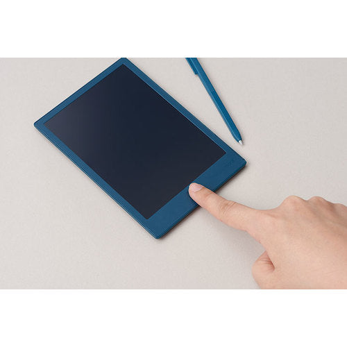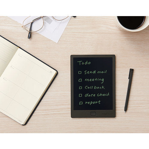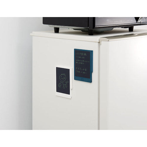 Catalog number: BB-14-W Features: ● An A6 notebook-sized electronic memo pad that can be written on and quickly erased over and over again. ● The screen can be erased with the push of a button. ● The battery is replaceable, so it can be used over and over again. ● A high-contrast LCD screen that changes line thickness according to pen pressure. ● Comes with a magnet and ruler memory on the back. ● You can save what you write on the Boogie Board as image data by scanning it with a dedicated app. Uses: ● As a temporary memo or substitute for sticky notes. Specifications: Color: White Height (mm): 148 Width (mm): 105 Thickness (mm): 5.5 Power supply: 1 coin-type lithium battery (CR2016) (included) Screen size: Approximately 6-inch LCD (93 x 124 mm) Power supply (V): 1 coin-type lithium battery (CR2016) (included) Screen size (mm): 93 x 124 Number of erasures: Approximately 30,000 times Material/Finish: Body: ABS resin Set contents/Accessories: Stylus pen Lithium coin battery (CR2016) Instruction manual
