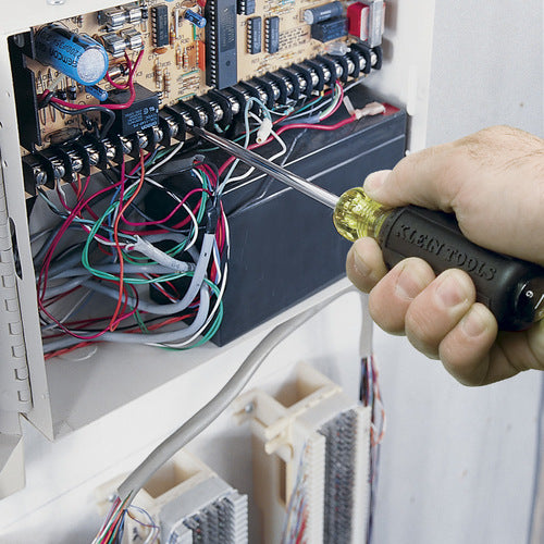 Catalogue number: 6016 Features: ● Thin tip allows you to work in tight spaces. ● Cushion grip handle provides comfortable use. ● The tip is machined with precision machinery for precision. ● The tip shape is marked on the grip end, so you can tell the tip shape even when it is stored in a tool holder. Specifications: ● Tip: [-] 5.0 ● Shaft length (mm): 152.4 ● Overall length (mm): 247.7 ● Grip color: Black ● Shaft diameter (mm): 4.8 ● Magnet: None ● Premium chrome plating Material/Finish: ● Shaft: Steel ● Grip: Rubber