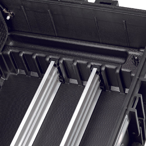 Catalogue number: 002137LE Features: ● Excellent dustproof, airtight and waterproof properties. ● Includes a tool panel with document dividers. ● The lockable bottom tray can be individually separated with an aluminium divider system. ● Comfort handle for ergonomics. Specifications: ● Colour: Black ● External dimensions (mm) width: 609 ● External dimensions (mm) depth: 428 ● External dimensions (mm) height: 263 ● Effective internal dimensions (mm) width: 540 ● Effective internal dimensions (mm) depth: 364 ● Effective internal dimensions (mm) height: 229 ● Padlock (sold separately): can be installed ● Maximum storage load (kg): 35 ● Width (mm): 609 ● Depth (mm): 428 ● Height (mm): 263 ● With air vent valve ● Usable temperature range: -30 to 80°C ● Padlock (sold separately) can be installed ● With two-wheel casters ● Tool storage panel: 54 pockets, 94 straps Material / Finish: ● Impact-resistant polypropylene