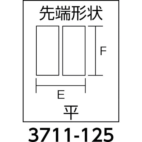 Catalog number: 3711-125 Features: ● High-precision pliers ideal for extremely precise electronics-related and precision equipment assembly work. ● Head is carefully chamfered. Specifications: ● Total length (mm): 125 ● Thickness (mm): 7.0 ● A (mm): 27.0 ● Tip shape: Flat ● Tip shape (mm) E x F: 2.0 x 5.5 ● Tip: Zinc alloy plating ● Handle: Plastic coating ● No serrations on tip Material/Finish: ● Special tool steel (forged, oil hardened) ● Grip: Soft plastic coating