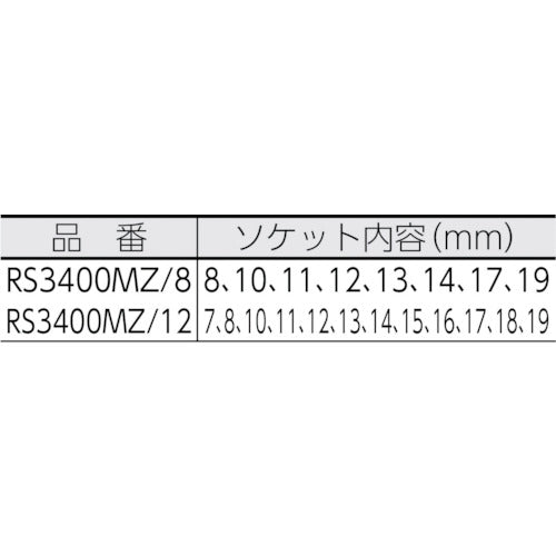 Catalog number: RS3400MZ/8 Features: ●Compact (short, thin) design that allows access to narrow spaces. ●Pursuing precision in each part provides an excellent usability. ●Newly shaped ball dimples provide a connection with less wobble. (PAT.) Specifications: ●Drive socket size (mm): 9.5 ●Socket contents (mm): 8, 10, 11, 12, 13, 14, 17, 19 ●Set contents (pieces): 8 ●Face shape: Hexagonal Material/Finish: ●Contents: Chrome molybdenum steel (SCM435) Set contents/Accessories: ●Socket rail (with magnet on bottom)