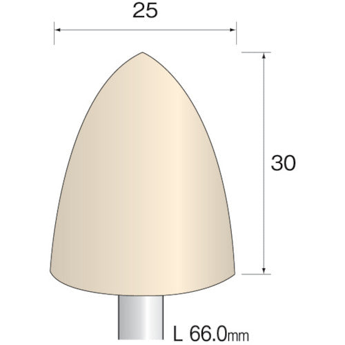Catalogue number: GA3062 Features: ● A buff made of high-quality, fine wool compressed at a high density. ● Excellent abrasive retention for effective polishing. Specifications: ● Type: Bullet-shaped, hard ● Outer diameter (mm): 25 ● Width (mm): 30 ● Shaft diameter (mm): 6.0 ● Shaft length (mm): 36 ● Maximum operating speed (rpm): 7000 ● Color: White ● Total length (mm): 66.0 ● Compatible materials: Ceramics, glass, tool steel, alloy steel, cemented carbide, cermet, general steel, stainless steel, aluminum, copper