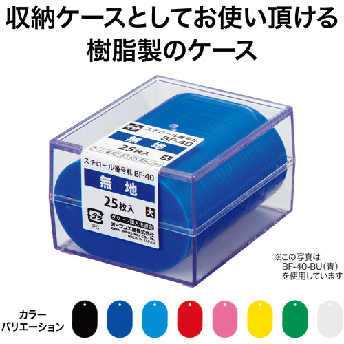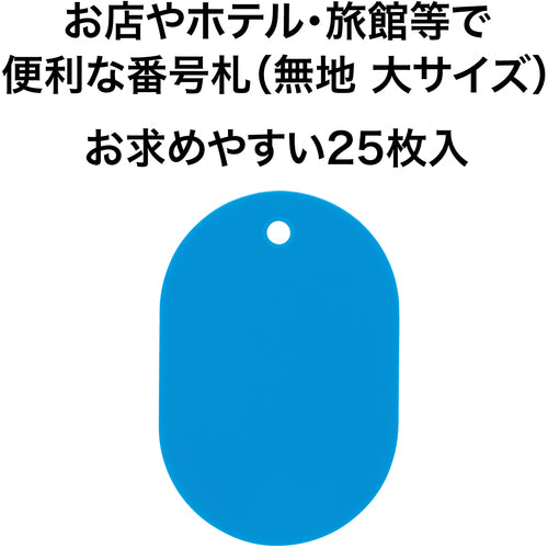 Catalog number: BF-40-LBU Features: ●Number tags are useful for shops, hotels, inns, etc. Specifications: ●Color: Sky ●Contents: 25 sheets ●Height (mm): 60 ●Width (mm): 40 ●Thickness (mm): 2.7 ●Hole diameter (mm): 5 ●Number tag size (mm): 60 x 40 x 2.7 ●Listed on GPN Eco Products Net Material/Finish: ●Recycled polystyrene