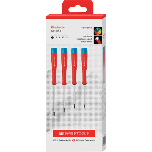 Catalog number: 8627CBB Features: ●Grip ends are color-coded according to tip shape. ●It is not slippery even when held with wet hands, is resistant to oil and gasoline, and can be easily cleaned even if it gets dirty. ●Comes with an outer box. Specifications: ●Set contents: SwissGrip precision tamper-proof hex lobe screwdriver T8, T9, T10, T15 (8124.B8-60, B9-60, B10-70, B15-80)