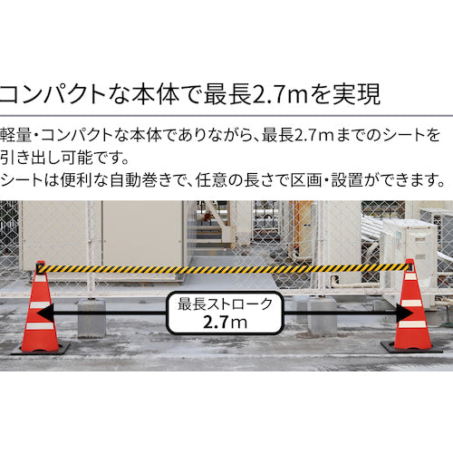 Catalog number: BRMS-5027APC Features: ●Automatic rewind sheet and folding cone for excellent storage. ●Compact body allows for up to 2.7m of section restriction. ●The folding cone has a reflective sheet for safe nighttime work. ●Comes standard with a cone weight for increased stability. Uses: ●For temporary restriction of people's access. Specifications: ●Color: Yellow/Black ●Display: Tiger ●Sheet width (mm): 50 ●Sheet thickness (mm): 0.2 ●Sheet stroke (m): 2.7 ●Length (m): 2.7 ●Includes 2 folding cones + 2 weights Material/Finish: ●Main body: ABS resin ●Sheet: Polyethylene ●Folding cone: Polypropylene Set contents/Accessories: ●Barrier reel mini x 1 ●Folding cone x 2 ●Cone weight x 2