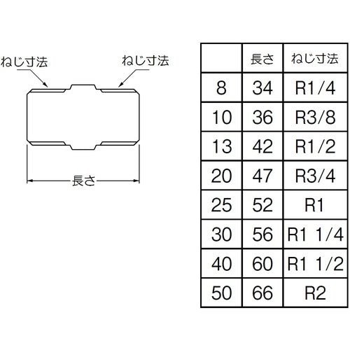 Catalog number: TS700-13 Usage: ●For connecting 13mm female threads. Specifications: ●Length (mm): 42 ●Thread size: R1/2 ●Nominal diameter: 13 ●Stainless steel hexagonal nipple. Material/Finish: ●SUS304