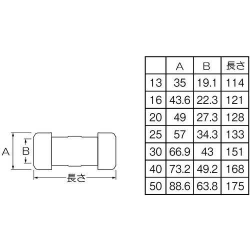 Catalog number: T940-50 Uses: ● For temporary repairs. ● For burial. Specifications: ● Length (mm): 175 ● B (mm): 63.8 ● A (mm): 88.6 ● Expansion joint for PVC piping. ● Tightening connection type. Material/Finish: ● PVC resin