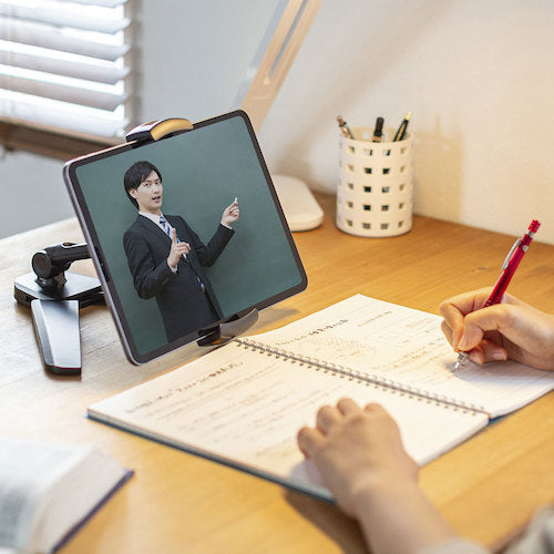 Catalog number: PDA-STN37BK Features: ● A desktop stand for iPads and tablets that can rotate 360 degrees and adjust the angle. ● Compatible with 6-inch to 13-inch tablets and smartphones. ● (Compatible sizes: 148-225 mm, thickness less than 17 mm) ● The holder has a hole through which the charging cable connector can pass, so you can use it by connecting the charging cable. ● The ball joint structure allows the holder to rotate 360 degrees, so the tablet can be used in either portrait or landscape orientation. ● The movable arm with a hinge structure allows you to use it at the optimal angle for your environment, from the angle suitable for viewing to the angle suitable for typing. ● The arm part has a cable holder function that can fix the charging cable. ● The stand part has a heavy feel and is stable even when using a tablet. ● The part that comes into contact with the desk or equipment has a scratch-resistant rubber pad to protect the desk and tablet from scratches. ● The hex wrench used for assembly and adjustment can be stored on the back of the stand to prevent it from being lost. Uses: ● Arm stand for tablets Specifications: ● Color: Black ● Width (mm): 273 ● Depth (mm): 190 ● Height (mm): 260 ● Compatible device size: Devices with widths of 148 to 225 mm or less and thicknesses of 17 mm or less Materials/Finish: ● Aluminum alloy (stand part) ● ABS resin, silicone rubber (holder part)