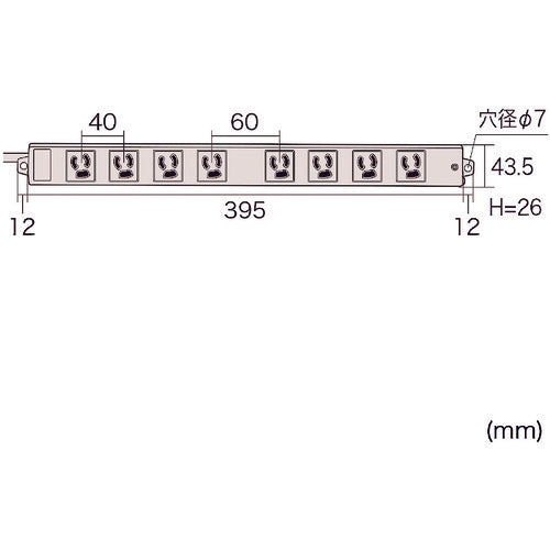 Catalog number: TAP-K8-10 Features: ●8-outlet, 3P anti-pullout, VCTF cord specification, 3P plug (with insulating cap). ●Equipped with a power indicator lamp that allows you to check the power status. ●With a magnet on the back, it can be easily temporarily fixed to a steel desk, etc., making maintenance easy and convenient. ●Easy to maintain. ●The socket part is made of urea resin that is resistant to heat and impact, giving it a double structure. ●3P (grounded) plug with insulating cap that is effective in preventing tracking fires. ●Uses simple plastic bag packaging that produces less waste and is environmentally friendly. Applications: ●For installation inside racks such as tablet charging storage cabinets. Specifications: Number of outlets: 8 outlets Cable length (m): 10 Color: Light gray Width (mm): 409 Depth (mm): 43.5 Height (mm): 26 Rated voltage (V): 25 (up to 1500W total) Rated current (A): 15 (up to 1500W total) Plug shape: Plug: 3P (with insulating cap) Outlet shape: Socket: 3P, 8 outlets (non-pullout type) Product name: Construction site tap Cord: VCTF 2.0 square (SQ) x 2 cores, 0.75 square (SQ) x 1 core (earth) Finished external dimensions (mm): Approximately diameter 8.5 Socket spacing (mm): 40mm *Center only 60 Compliance standards: Compliant with technical standards of the Electrical Appliance and Material Safety Act (PSE)