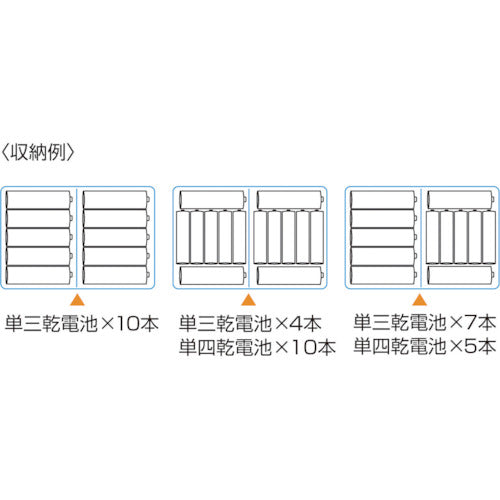 Catalog number: DG-BT5C Features: ●This battery case can accommodate both AA and AAA batteries. ●The battery rises when you press the edge, so even those with long fingernails can easily remove it. ●Made of lightweight, shatter-resistant PP material. ●Large capacity type ideal for storing rechargeable batteries and unused batteries. Specifications: ●Type: AA, AAA ●Width (mm): 120 ●Depth (mm): 90 ●Height (mm): 21 ●Storage capacity: AA: 10 AAA: 10 ●Color: Clear ●Storage capacity<1> (pcs): 10 (AA batteries) ●Storage capacity<2> (pcs): 4 (AA batteries), 10 (AAA batteries) ●Storage capacity<3> (pcs): 7 (AA batteries), 5 (AAA batteries) Material/Finish: ●Polypropylene (PP)