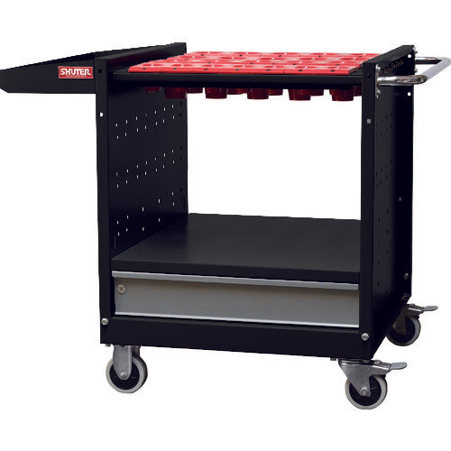Catalog number: NTW-4B1D-BT40-BK Features: ● Tool holder bench can rotate up to 25 degrees, making it a touring wagon that is easy to store and take out. Uses: ● For efficient storage of touring tools. Specifications: ● Maximum load capacity (kg/unit): 200 ● Number of storage holders: TW-BT-40 28 pieces ● Color: Black ● Width (mm): 1002 ● Depth (mm): 650 ● Height (mm): 810 ● Uniform load capacity (kg/tier): 25 ● Caster diameter (mm): 100 ● Holder color: Red ● Main body: Black ● BT-40: 28 units ● BT-30 ● BT-50 ● HSK-63 ● PP caster 100mm ● Drawer inner dimensions: W300 x D515 x H94mm Material/Finish: ● Main body: Steel ● Holder: ABS resin ● Caster: Polypropylene Set contents/Accessories: ● 2 keys