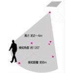 Catalog number: SK-SWLT200WH Features: ● Detects human movement in the dark and automatically turns on for about 15 seconds. ● Solar charging type, so it can be installed in places without outlets and is electricity and maintenance free. Applications: ● For entrances and crime prevention measures. ● For night lighting and floodlights in places without power sources. Specifications: Width (mm): 137 Depth (mm): 96 Height (mm): 85 Light source color: White Power supply: Lithium ion 3.7V 1200mAh Illumination retention time: Approximately 15 seconds (at high brightness) Brightness (lm): 200 Sensor detection method: Infrared detection method Sensor detection angle: Maximum approximately 120° Sensor detection distance: Maximum approximately 8m Bulb used: COB LED x 3 lights (back side) Dustproof and waterproof rating: IP65 Material / Finish: ABS resin Set contents / Accessories: Concrete sleeve (white) x 2 Operation mode setting pin x 1 Top mounting hole cover claw x 1 Special adhesive tape x 2 Mounting screws x 2 Instruction manual Caution: Please use in a place where the solar panel receives sufficient sunlight. It will not light up when the surroundings are bright.