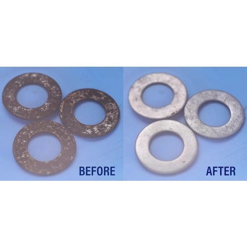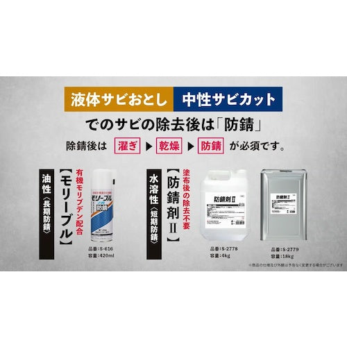 Catalog number: S-9816 Features: ● A rust, discoloration, and cloudiness remover that can also be used on aluminum and copper. ● Does not turn black even after long periods of immersion, and can provide a good finish to metal surfaces. Uses: ● Removes rust, discoloration, and cloudiness from aluminum and copper. Specifications: ● Color: Colorless ● Width (mm): 241 ● Depth (mm): 239 ● Height (mm): 402 ● Container type: Bag-in-box ● Capacity (kg): 18 ● Concentration used: Undiluted to 30 times water Material/Finish: ● Main ingredients: Chelating agent, rust remover