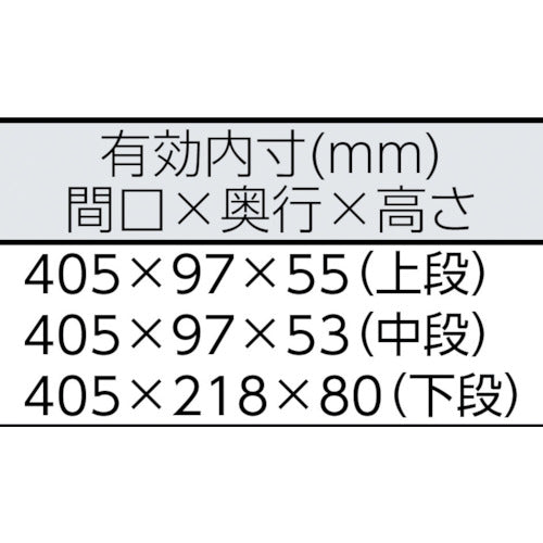 Catalog number: BX331BK Features: ●Flat top V-shaped 3-tier double-opening case. ●A new tool case with added guard function on the corners of the case. ●Eliminates dead space and makes effective use of storage space. ●Sturdy and shock-resistant. Uses: ●For storing and managing tools Specifications: ●Color: Matte black ●External dimensions (mm) Width: 433 ●External dimensions (mm) Depth: 220 ●External dimensions (mm) Height: 240 ●Effective internal dimensions (mm) Width: 405 ●Effective internal dimensions (mm) Depth: 97 ●Effective internal dimensions (mm) Height: 55 (top tier), 405 ●Padlock (sold separately): Can be installed (φ7mm) ●Case dimensions (mm): 433 x 220 x 240 ●Double-opening case type ●Flat top V-shaped 4-tier double-opening case ●With inner tray Material/Finish: ●Body: Steel