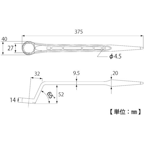 Catalog number: SM-27SB Features: ● Neck angle is 65°. ● Ideal for tightening torsion-type high-strength bolts (sear bolts) and aligning holes in steel frames. ● The long overall length makes it easy to apply force. Applications: ● For tightening torsion-type high-strength bolts and aligning holes in steel frames. Specifications: ● Opposite side dimensions (mm): 27 ● Overall length (mm): 375 ● Height (mm): 52 ● Opposite side (mm): 27 ● Used for tightening torsion-type bolts. Material/Finish: ● Chrome vanadium steel ● Surface treatment: Cathodic electrochemical coating Caution: ● Do not use as a hammer. Do not use for any purpose other than the intended use of the tool.
