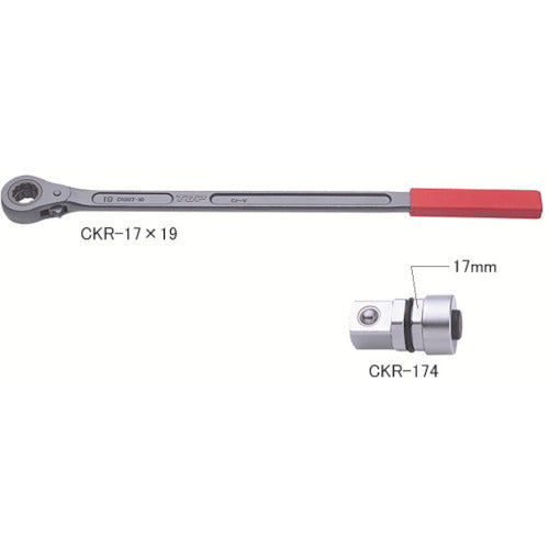 Catalogue number: CKR-174 Features: ● Insert from the 19 mm side of the jaw replacement wrench body, allowing the use of sockets with a 12.7 mm insertion angle. Applications: ● Can be used with any model. Specifications: ● Dedicated adapter for jaw replacement wrench ● Push button for one-touch attachment and detachment of sockets Material/Finish: ● Special alloy steel Caution: ● Use a size that matches the two-face width of the bolt/nut, and do not apply diagonally or shallowly. ● Do not use for any purpose other than the intended purpose of the tool.