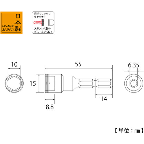 Catalog number: EHX-10B Features: ●With ball, it catches screws and threads securely. ●Can also be used for screws and threads other than iron that do not stick to magnets. ●Tip tool with magnet. Uses: ●Ideal tip tool for attaching and removing hexagonal bolts, screws, and text screws. Specifications: ●Face size (mm): 10.0 ●Shaft size (mm): 6.35 ●Total length (mm): 55 ●Face shape: Hexagonal surface ●Nut receiving depth (mm): 9.0 ●Drive socket size (mm): 6.35 ●Outer diameter (mm): 15 ●Ideal for attaching and removing hexagonal bolts, screws, and text screws. With ball, it catches screws and threads quickly and improves work efficiency. Material/Finish: ●Chrome molybdenum steel Caution: ●Please use correctly and safely within the guaranteed torque. If excessive load is applied, the hexagonal shank may be damaged. Using it diagonally or shallowly on bolts and nuts may cause damage.