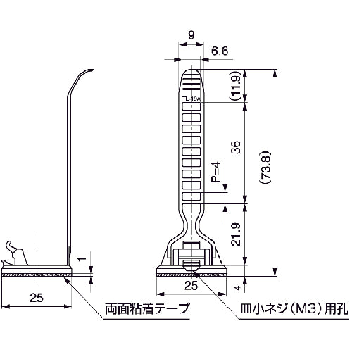Catalog number: TL-19AB-BK Features: ●The belt can be folded back and locked to allow for free bundling and unbundling. ●Adhesive tape and screw fastening can be used together. Specifications: ●Color: Black ●Length (mm): 25 ●Width (mm): 25 ●Height (mm): 73.8 ●Storage capacity (mm): 3-19 ●Maximum bundling diameter (mm): 19 ●Load strength (N): 150 ●For indoor use Material/Finish: ●Nylon 66