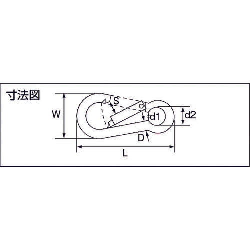 Catalog number: TSF-4SB Features: ●Standard spring hook. Applications: ●For connecting chains, wires, ropes, etc., and for joining terminal fittings. ●As a connecting fitting. Specifications: ●Working load (kN): 0.29 ●D (mm): 4 ●L (mm): 40 ●S (mm): 6 ●W (mm): 20 ●d1 (mm): 4.5 ●d2 (mm): 6.0 Material/Finish: ●Stainless steel (SUS304)