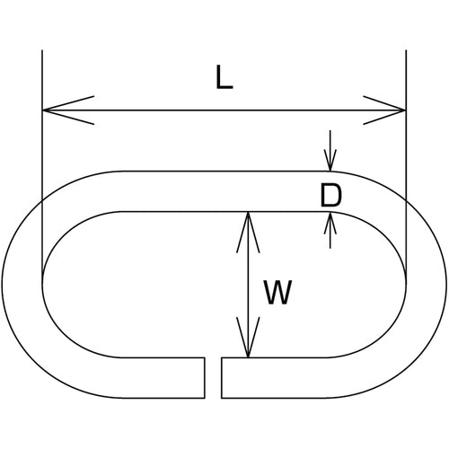 Catalog number: TRG-9 Features: ● Close by squeezing with pliers. Applications: ● As a connecting metal fitting for chains, etc. Specifications: ● Load capacity (kN): 0.98 ● D (mm): 9 ● L (mm): 39 ● W (mm): 13 Material/Finish: ● Stainless steel (SUS304)