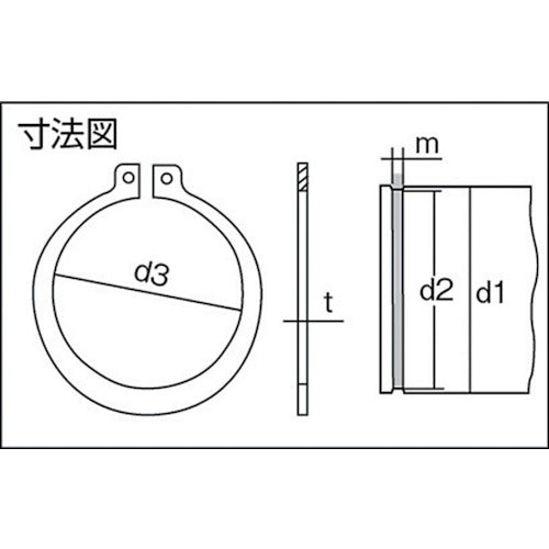 Catalog number: B90-0035 Features: ●Equipped with a lug (hole for pliers), making it easy to attach and remove. Specifications: ●Nominal diameter: S-35 ●Stop ring (mm) d3: 32.2 ●Stop ring (mm) t: 1.50 ●Compatible shaft (reference) (mm) d1: 35 ●Compatible shaft (reference) (mm) d2: 33.0 ●Compatible shaft (reference) (mm) m: 1.65 ●Package: Bolt pack (blister pack) ●For shafts Material/Finish: ●Stainless steel (SUS304CSP)