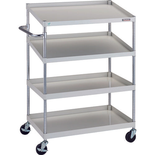 Catalog number: PEW-1292N2-W Features: ●Antibacterial powder coating allows for long-term, clean use. (SIAA antibacterial ISO22196: JP0122258A0002X) ●Shelf is inclined (12° for a depth of 500 mm, 10° for a depth of 600 mm), making it suitable for work where items are frequently taken in and out. ●Shelf can be used on both sides, and one-touch bushings make assembly easy. ●A pipe-type wagon with silent casters for a quiet and smooth feel. Applications: ●Factories, warehouses, stores, etc. ●For storing and keeping small items such as tools and documents. Specifications: ● Maximum load capacity (kg/unit): 150 ● Uniform load capacity (kg/tier): 100 ● Color: White ● Width (mm): 990 ● Depth (mm): 600 ● Height (mm): 1300 ● Number of tiers: 4 ● Post diameter (mm): 25.4 ● Caster diameter (mm): 100 ● Spill guard height (mm): 50 ● Shelf adjustment pitch (mm): 25 ● Casters: Free-wheeling 100mm (2 pcs.) Free-wheeling (with stopper) 100mm (2 pcs.) ● Inclined shelf uniform load (g): 100K Materials/Finish: ● Body: Steel (painted parts: antibacterial powder coating) ● Handle, posts: Steel (chrome plated) ● Caster fittings: Steel ● Wheels: Elastomer (quiet type)