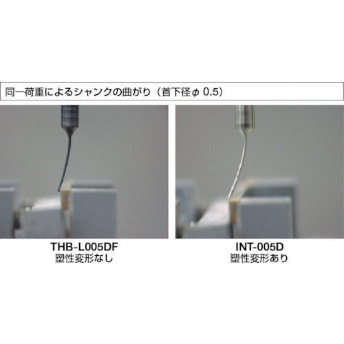 Catalog number: THB-L008MF Features: ● For rough machining, deburring, and burr removal. ● The special high-hardness treated stainless steel shank provides a shank that is both firm and flexible. ● By bringing the surface hardness (Hv1000 or more) close to that of carbide, deformation and breakage are significantly reduced. ● The increased elasticity makes the shank less likely to break. ● Precision machining is possible because the shank is less likely to bend. ● Machining time is significantly reduced because it is possible to work with high loads. ● Machining can be performed with approximately twice the pressure compared to conventional products. (Compared to our company) Applications: ● Suitable workpiece materials: carbon steel, alloy tool steel, high-speed tool steel, bearing steel, case hardened steel, hardened steel, stainless steel. Specifications: ● Grit (#): 230 ● Blade diameter (mm): 0.8 ● Blade length (mm): 3 ● Shaft diameter (mm): 3 ● Total length (mm): 50 ● Shape: Cylinder ● Tip angle (°): 0 ● Maximum operating speed (rpm): 80000 ● Neck length (mm): 9 ● Number of pieces in a set: 1