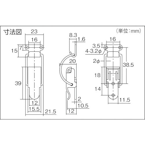 Catalog number: P-147-2 Features: ● Metal fittings can be attached while avoiding protruding parts. Specifications: ● Main body mounting hole dimensions (mm): 3.5 ● Receiving hole dimensions (mm): 3.4 Material/Finish: ● Cold-rolled steel plate (SPCC) ● Surface treatment: Trivalent unichrome plating finish