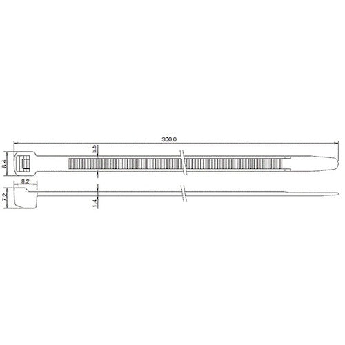 Catalog number: TPK-300SH Features: ●High-performance cable tie that can withstand high-temperature environments. ●Ideal for places where heat resistance, abrasion resistance, and impact resistance are required. ●Suitable for medical equipment that requires chemical resistance and radiation resistance, and X-ray equipment that generates gamma radiation. Applications: ●For automobiles, generators, agricultural equipment, railways, ships, clean rooms, and food processing machines. Specifications: ●Color: Ivory ●Width (mm): 5.5 ●Length (mm): 300 ●Thickness (mm): 1.4 ●Maximum bundling diameter (mm): 85.0 ●Tensile strength (N): 539 ●Minimum bundling diameter (mm): 10.0 ●For indoor use ●Usage temperature range: -55℃ to 260℃ Material/Finish: ●Polyether ether ketone (PEEK resin) Caution: ●Please strictly adhere to the minimum diameter of the bundling diameter. The strip may break.