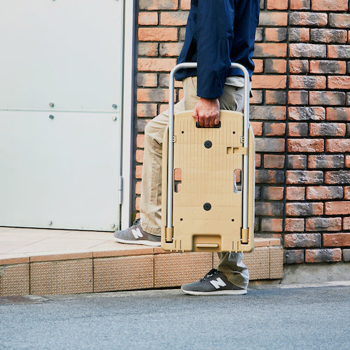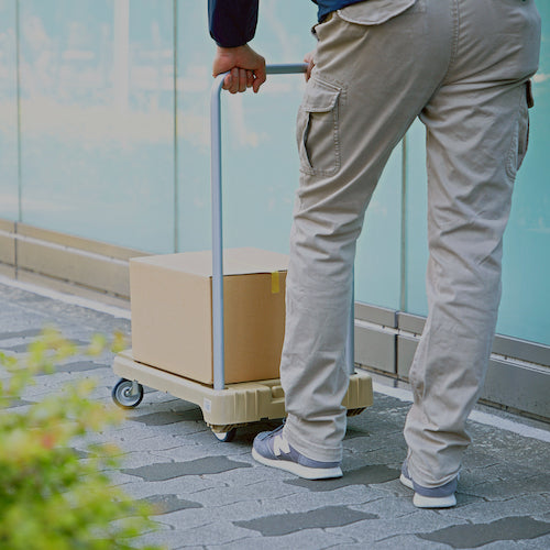 Catalog number: MP-6039N2-LS Features: ●The use of φ75 noise-reducing casters makes it quiet. ●The use of elastomer resin wheels makes it more resilient and lighter to move than conventional rubber wheels, reducing tire marks. ●It weighs only 3.9 kg (approximately 9% lighter than conventional products), reducing the burden on the worker and making it easy to carry (move). ●A wide variety of colors are available to meet a variety of situations and needs. ●The handle can be stored inside the main body, saving space. ●When the handle is stored, it can be used as a platform cart. ●The one-touch mechanism makes it easy to lock and unlock the handle. ●It can be placed upright. Uses: ●For transporting documents in offices, etc. ●For taking out the trash at home, etc. Specifications: ●Uniform load (kg): 100●Color: Light sand●Length (mm): 600●Width (mm): 390●Height (mm): 125●Handle height (mm): 790●Caster diameter (mm): 75●Compatible stoppers: KW-GJS, MP-6039NFB●Finished product●2 swivel casters, 2 fixed casters●Noise level: 40.75dB●Folding handle type Material/Finish: ●Cargo platform: 100% recycled polypropylene (PP) recycled material●Handle: Steel●Handle surface treatment: Melamine baked paint●Caster fittings: Steel Caution: ●When using or carrying with the handle folded down, be sure to lock the handle. ●There is no tip-over prevention function. ●Please be careful not to tip over.