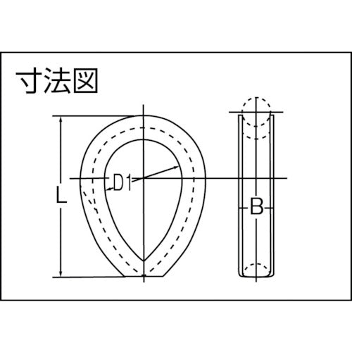 Catalog number: TAT-09 Features: ●Prevents direct load from being applied to the eye of the wire rope, preventing deformation and wear. ●Extends the life of the wire rope. Applications: ●As a wire course and stopper when processing the end of a wire rope into an eye. Specifications: ●Applicable rope diameter (mm): 9 ●B (mm): 11 ●L (mm): 51 ●D1 (mm): 25 ●Surface treatment: Hot-dip galvanized ●Complies with the old JIS B2802 standard Material/Finish: ●Steel ●Surface treatment: Hot-dip galvanized
