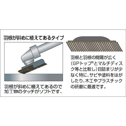 Catalog number: GP100S Features: ● The blades are at an angle, so they are soft to the touch on the workpiece. ● They have heat dissipation properties, so there is almost no distortion or burning of the workpiece due to heat. Applications: ● Polishing before plating, polishing metal surfaces, removing rust, and deburring. ● Polishing woodworking and plastic. ● Tools used: Disc grinder. Specifications: ● Grit size (#): 180 ● Outer diameter (mm): 100 ● Blade length (mm): 15 ● Hole diameter (mm): 15/16 ● Abrasive: Alundum ● Maximum operating speed (rpm): 13600 ● Number of blades (pieces): 90 ● Maximum operating peripheral speed: 72 m/s (4300 m/min) Material/Finish: ● Alumina abrasive Set contents/Accessories: ● One 15 mm hole adapter included in each box (sold separately: GPTA-1P) Caution: ● Always wear protective equipment such as a hard hat and safety glasses when working.