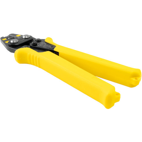 Catalog number: TP-RS Features: ●A must-have tool for electrical engineering skill tests. ●Double-sided color marker specifications for improved work efficiency. ●Temporary clamping is possible, allowing for smooth insertion of wires. ●JIS C9711 certified product. ●Built-in molding confirmation mechanism makes the crimping mark clear, preventing mistakes. Applications: ●For crimping ring sleeves. Specifications: ●Total length (mm): 178 ●Crimp terminal ([[MM2]]) for ring sleeves: small (1.6 x 2), small, medium Material/Finish: ●Body: Carbon steel for mechanical construction ●Grip: Elastomer resin ●Head: Chromium molybdenum steel Caution: ●This is a non-insulated tool. Turn off the power before use. ●Do not use for any other purpose. ●See other precautions on the product backing.