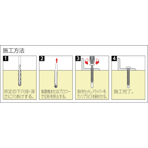 Catalog number: PS-432DN Features: ●Can be used in concrete without using a plug, and can be easily installed with a normal screwdriver. Applications: ●For various installations such as pipe saddle fasteners, switch boxes, curtain rails, storage shelves, air conditioning equipment, lighting fixtures, and interior base materials. Specifications: ●Nominal diameter d (mm): 4 ●Drill hole diameter (mm): 3.5 ●Embedding depth (mm): 30 ●Maximum tensile load (kN): 2.2 ●Drilling depth (mm): 32 ●Length (mm): 32 ●Compatible screwdriver: Phillips No. 2 ●Head shape: Pan head ●Compatible materials: Concrete, block, clear pack Material/Finish: ●Stainless steel Caution: ●The maximum tensile load is the value when the concrete strength is Fc21N/mm [squared]. ●Drill holes should be at least 10 mm deeper than the embedding length.