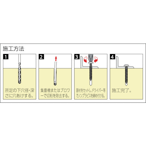 Catalog number: PWS-425DN Features: ●Can be used in concrete without using a plug, and can be easily installed with a normal screwdriver. Applications: ●For various installations such as pipe saddle fasteners, switch boxes, curtain rails, storage shelves, air conditioning equipment, lighting fixtures, and interior base materials. Specifications: ●Nominal diameter d (mm): 4 ●Drill hole diameter (mm): 3.5 ●Embedding depth (mm): 20 ●Maximum tensile load (kN): 1.5 ●Drilling depth (mm): 25 ●Length (mm): 25 ●Compatible screwdriver: Phillips No. 2 ●Head shape: With seat ●Compatible materials: Concrete, block, clear pack Material/Finish: ●Stainless steel Caution: ●The maximum tensile load is the value when the concrete strength is Fc21N/mm [squared]. ●Drill holes should be at least 10 mm deeper than the embedding length.